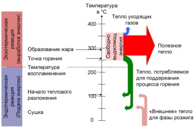 Пиролиз древесины происходит при температуре 200 – 800°С. Пиролиз - экзотермический процесс, проходящий с выделением тепла, за счет чего, улучшается прогрев и сушка топлива в котле, и происходит подогрев поступающего в зону горения воздуха.